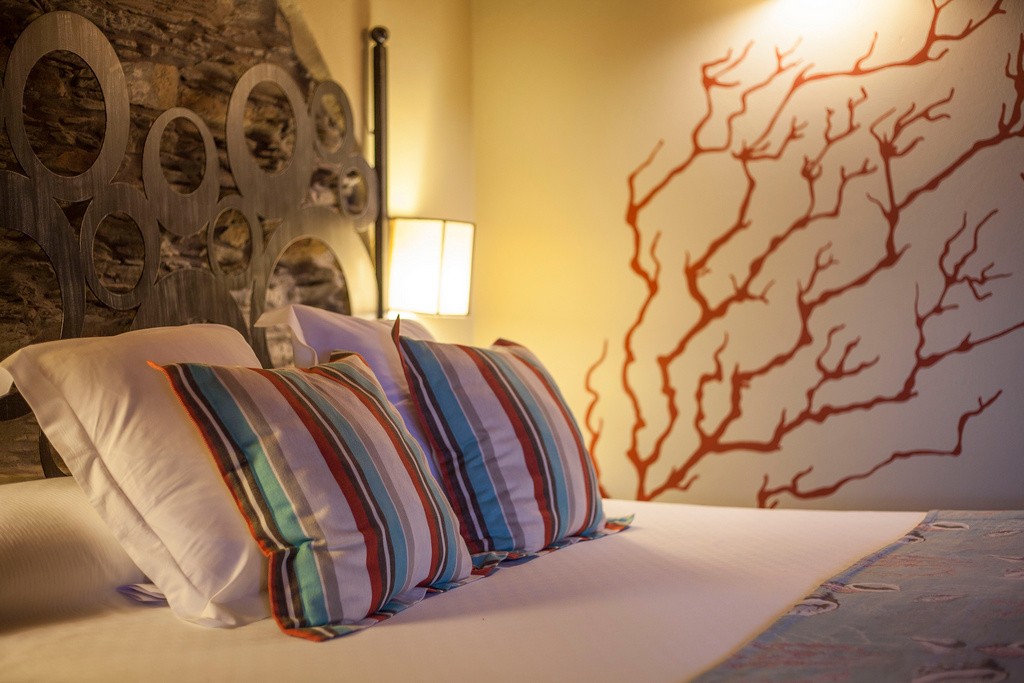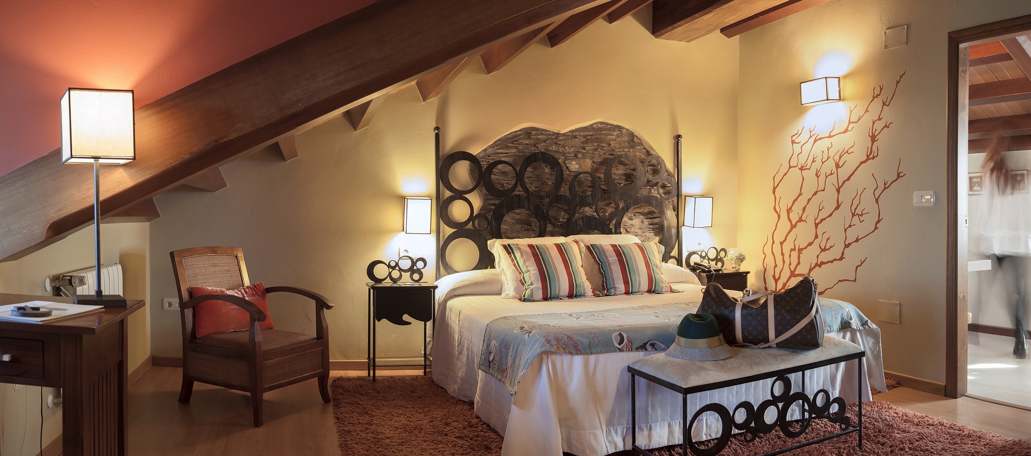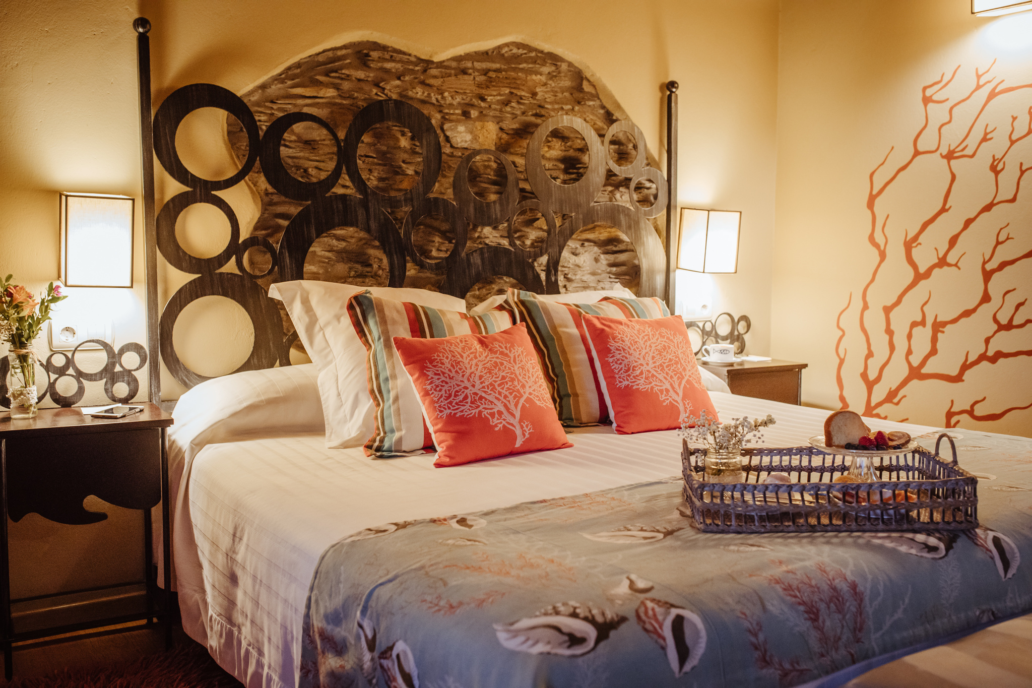 La Habitación Deluxe LA GOLONDRA es una habitación tranquila situada en el último piso. Es una habitación abuhardillada llena de magía y encanto por  sus vigas de madera que se mezclan con los corales pintados. Tiene una confortable  cama de matrimonio de 180 y unas espléndidas vistas al mar. Su Jacuzzi ovalado nos invita a tomarnos un baño y relajarnos después de ver desde la ventana de la habitación una espectacular puesta de Sol.